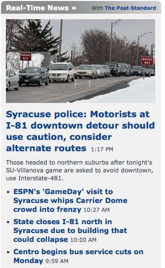 So why is it that when the area is faced with a similar relic of a mass transit system, with bus-only public transportation since 1941, there is no similar outcry about modernization? Is Syracuse not interested in recruiting the young people who are drawn to walk- and bike-friendly cities? The tourists who may want to leave their car at home? Yes, just as with the stadium, there are a host of concerns and arguments surrounding this one issue, and multiple physical, political and financial barriers. Thirty years ago, a formal study into the project began before any of these questions had been addressed, which unfortunately got the community riled up. On a more positive note, the community got riled up: articles and letters to the editor about the new stadium dominated the newspaper almost every day for two years. Is there any formal discussion about mass transit in Syracuse at this time, other than the "Community Planning and Transportation Public Survey" (linked on front page of City of Syracuse website), a paltry six-question survey that barely mentions transportation? Or this recent Centro headline, which couldn't be more ironically placed? (from Syracuse.com, February 27, 2010)