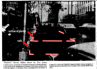 In downtown Syracuse federal and state urban renewal funds are being utilized to install "planters" containing trees and bushes in South Salina Street—making it narrower and posing potential driving hazards.